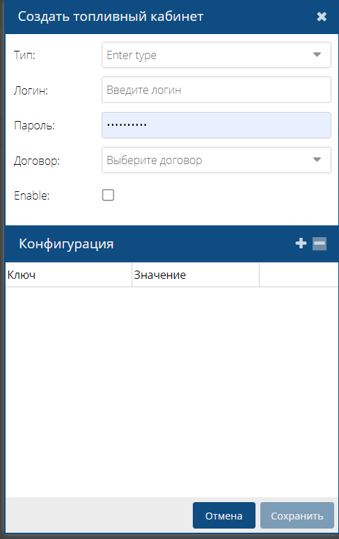 Раздел предназначен создавать и просматривать топливные кабинеты.