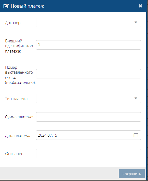 Окно выставления  нового платежа Клиенту.