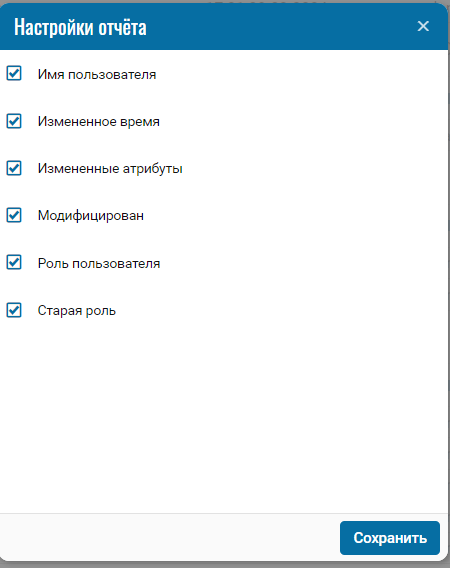 Отчет содержит   данные  по  имени пользователя, время изменения, измененные атрибуты , измененную роль пользователя.