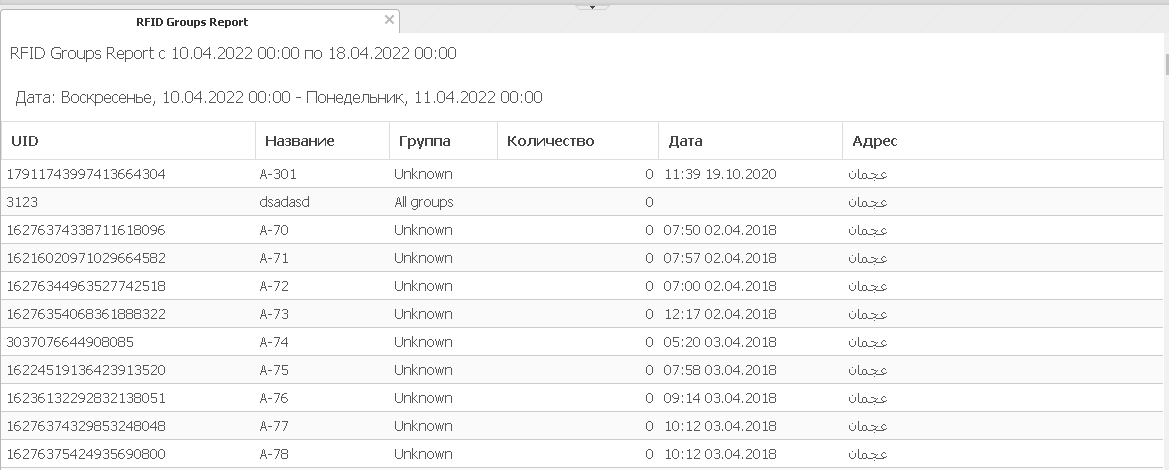 Групповой отчёт RFID предназначен для просмотра взаимодействий с метками по группам.