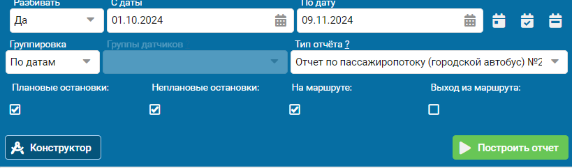 Отчёт по пассажиропотоку (городской автобус) позволяет вести учёт пассажиропотока и учёт плановых и внеплановых остановок.