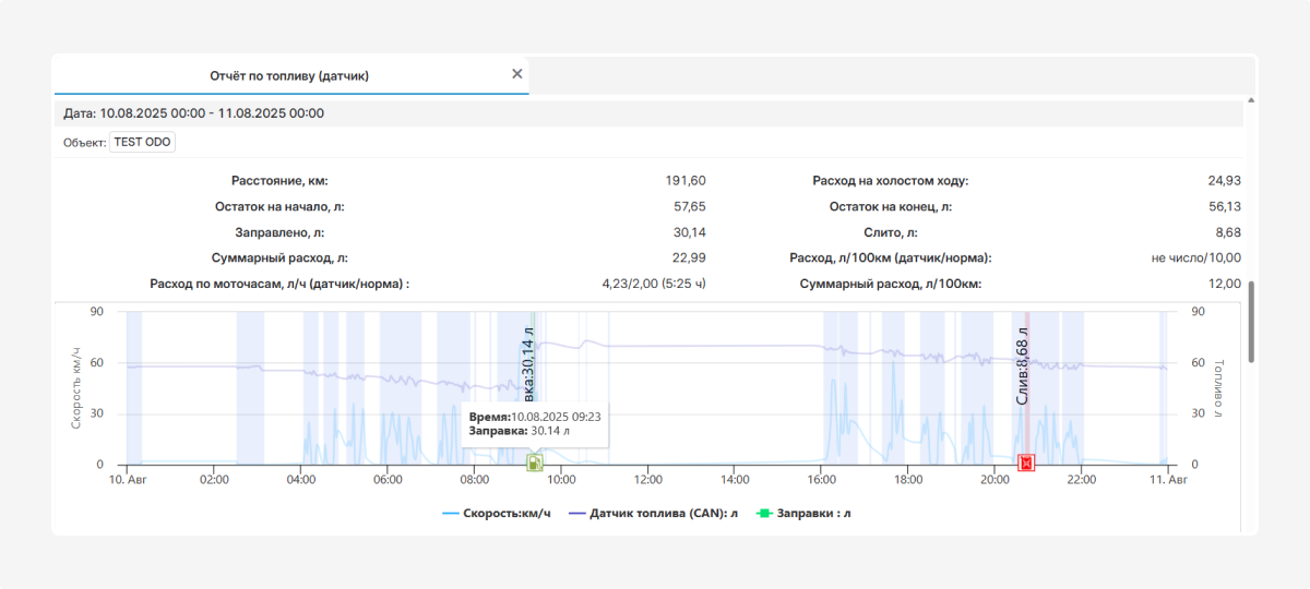 Этот отчёт показывает, как менялись скорость и уровень топлива за выбранный период. С его помощью вы можете контролировать расход топлива и отслеживать заправки и сливы.