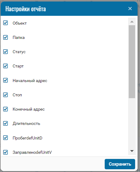 Данный отчёт выводит информацию по поездкам с начальным и конечным адресом, длительностью, пробегом , заправкой , расходом топлива итд.