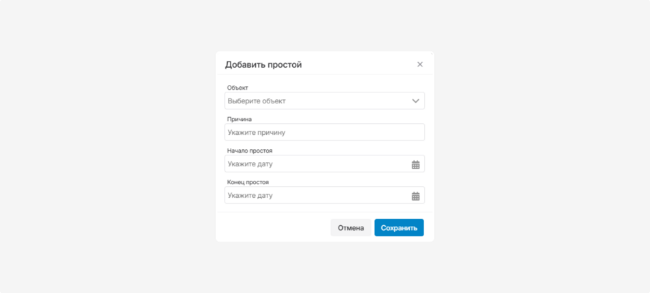 • Выберите дату и время начала и окончания простоя, используя календарь