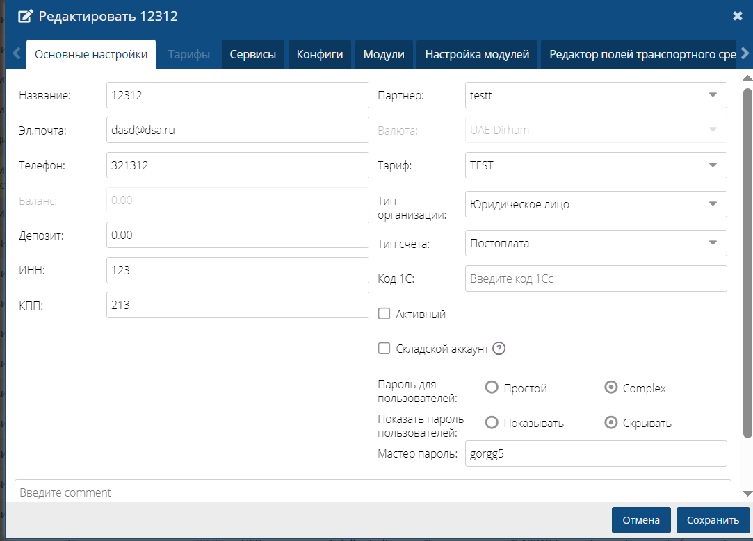 Заполнить окна договора (основные настройки , модули).