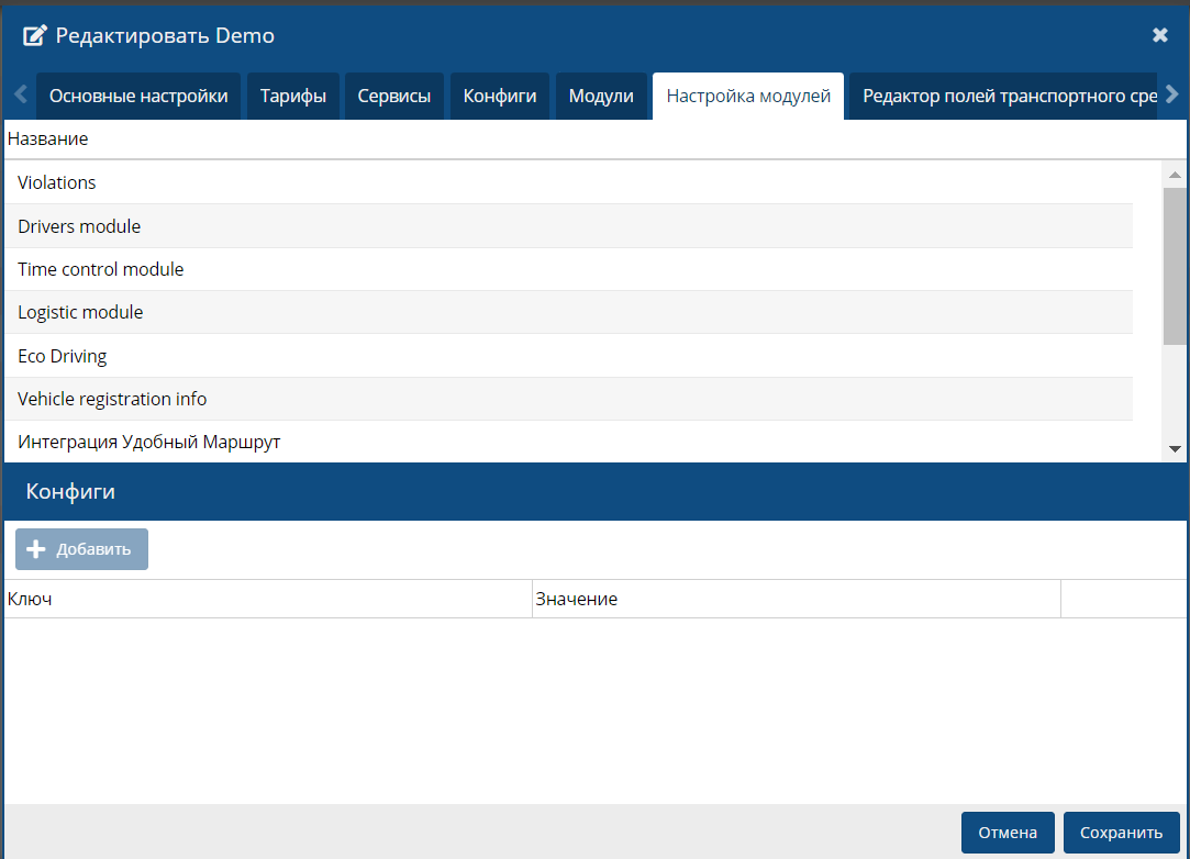 Окно настроек модулей предназначено для внесения дополнительных настроек в работу модуля.