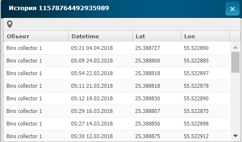 В истории указан объект и время взаимодействия с меткой, так же как и её координаты.