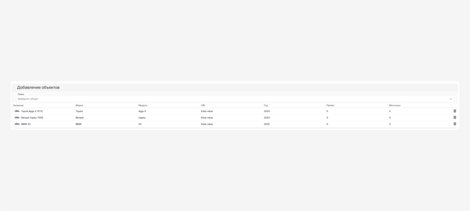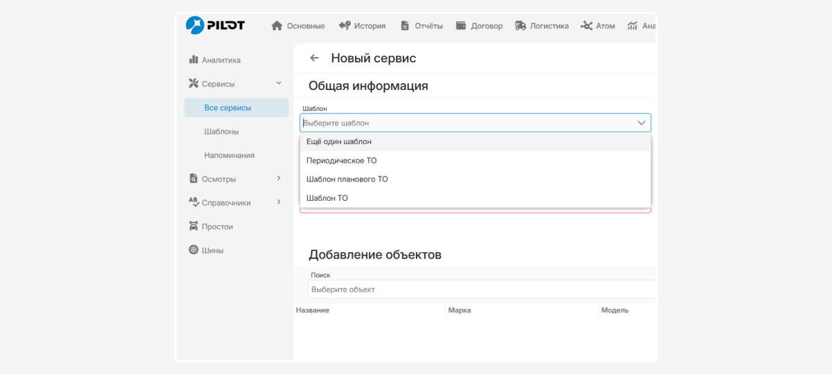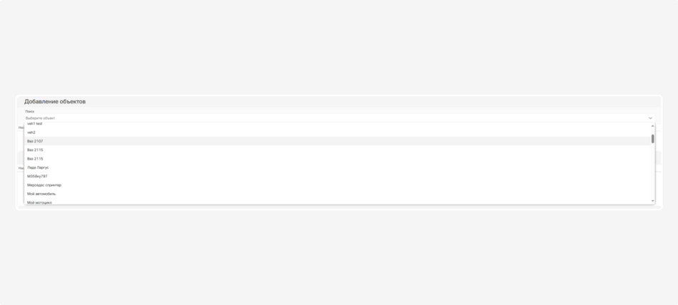 Укажите, какие объекты участвуют в этом сервисе. В секции «Добавление объектов» выберите один или несколько объектов из выпадающего списка.