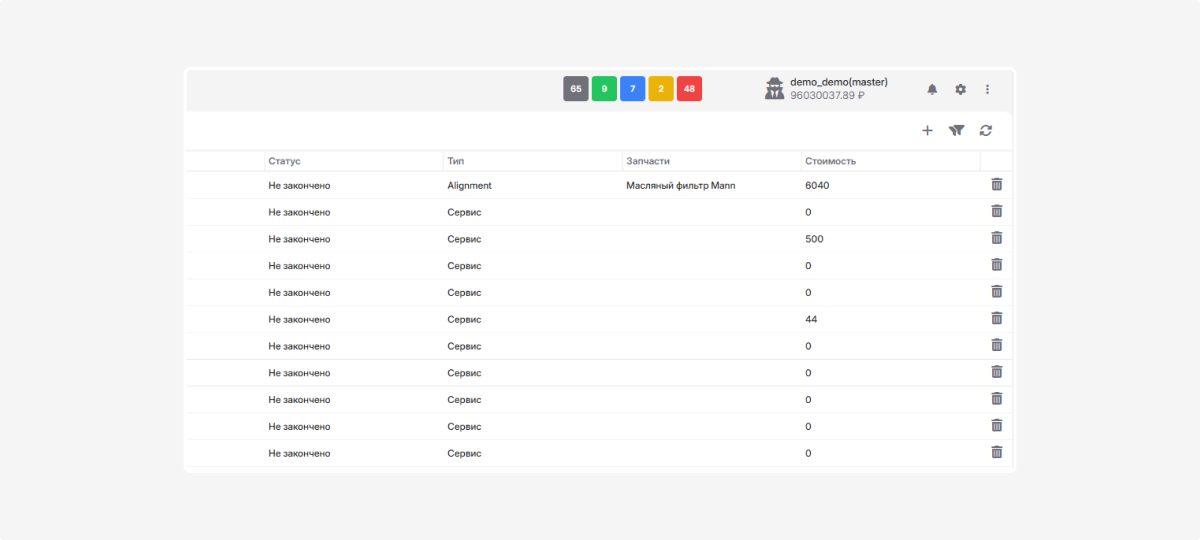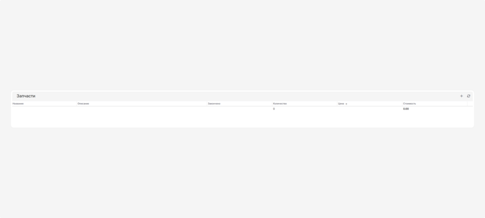 Добавленные запчасти появятся в списке запчастей сервиса. Их общая стоимость рассчитается автоматически.
