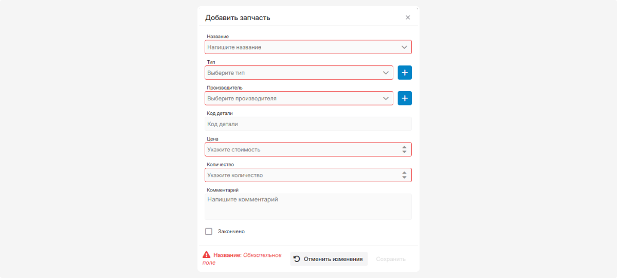 Комментарий — при необходимости4. Отметьте «Закончено», если запчасть установлена5. Нажмите «Сохранить»