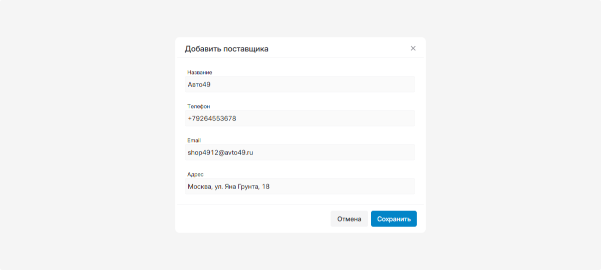 Поставщик — выберите из выпадающего списка. Как добавить поставщика, смотрите ниже