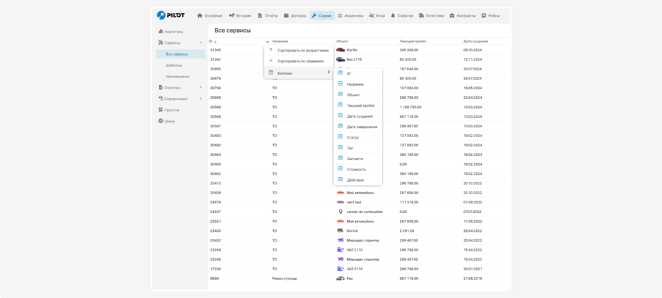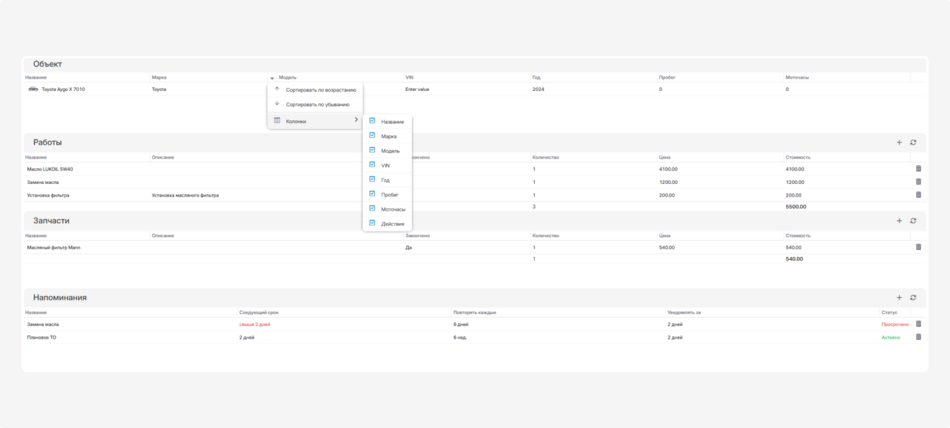 В сервисной записи настраивайте таблицы объектов, работ, запчастей и напоминаний. Выбирайте параметры, которые будут отображаться в колонках.