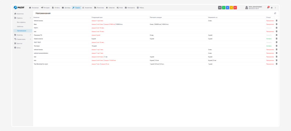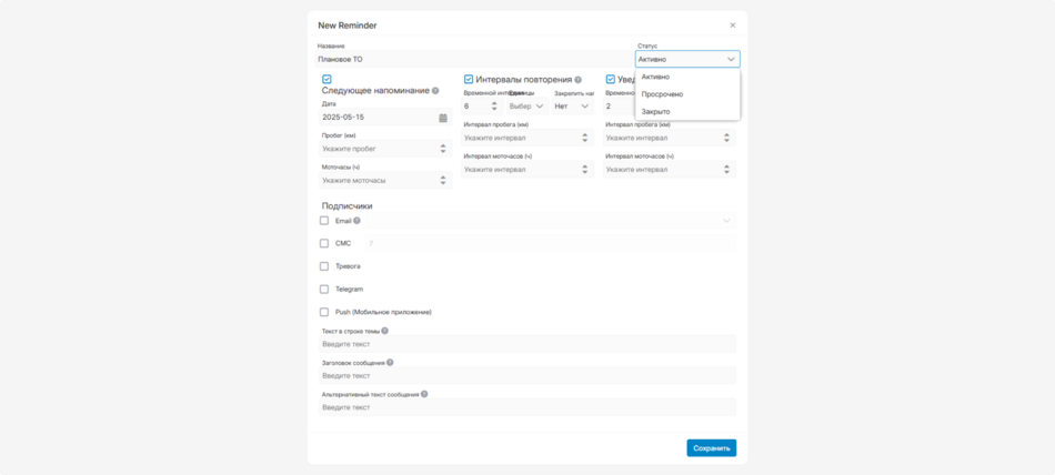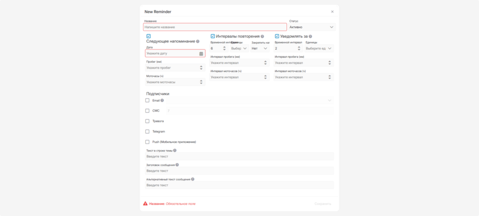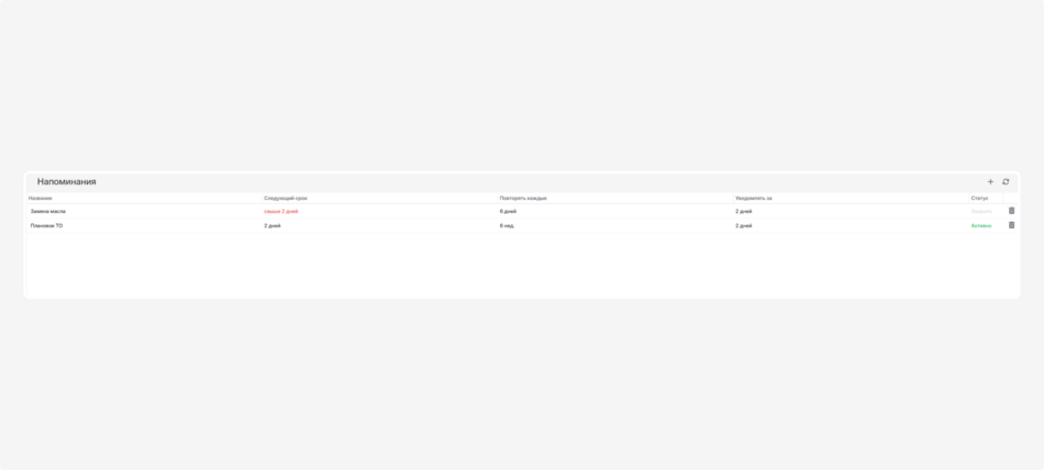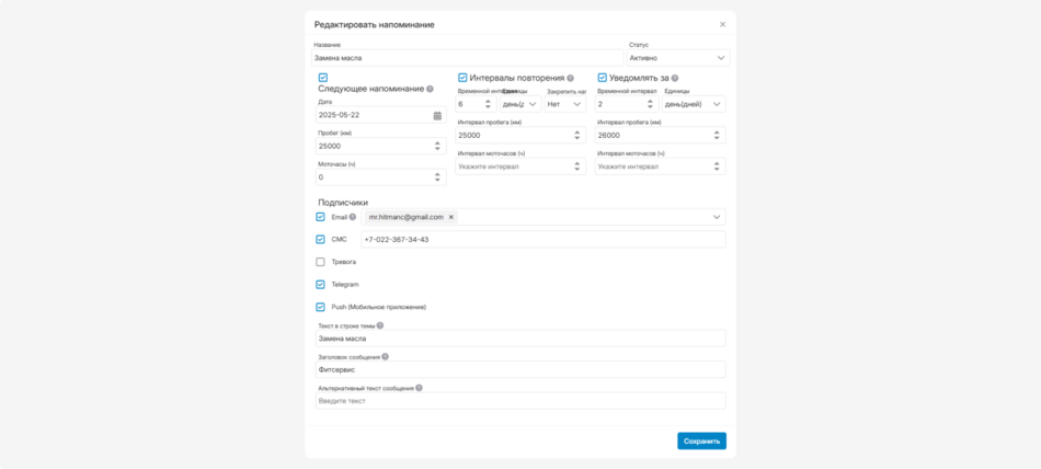 В секции «Напоминания» настраивайте автоматические напоминания о сервисах.
