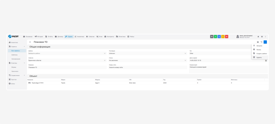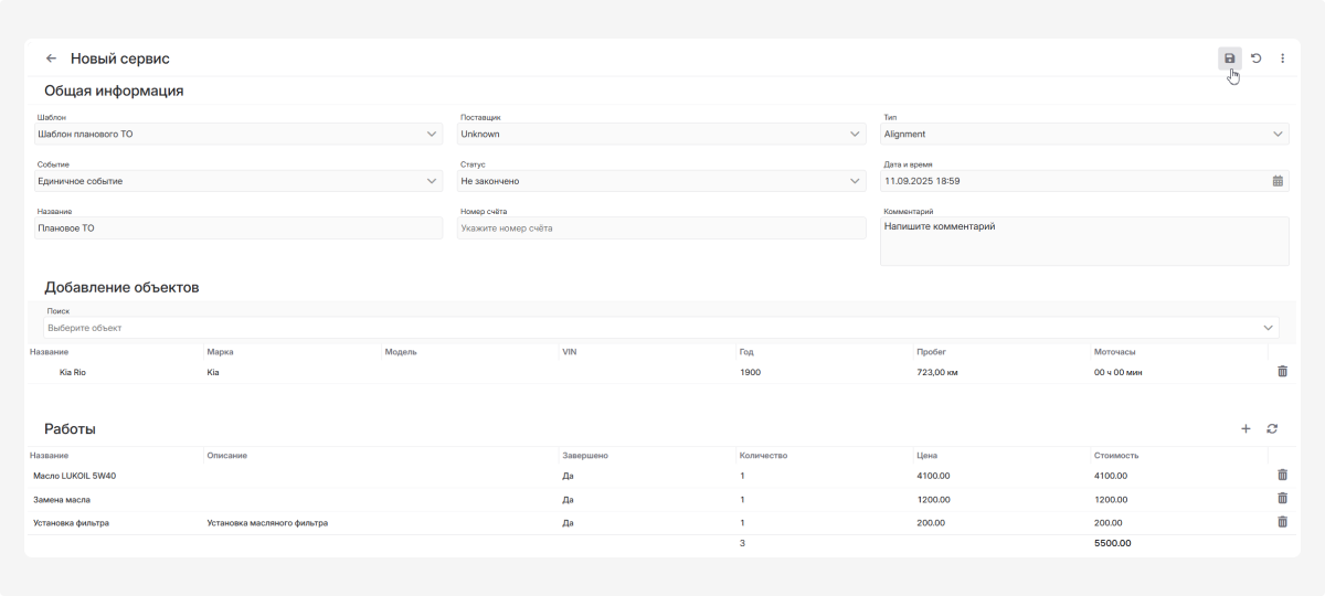 1. Создайте новую запись о сервисном обслуживании или откройте уже существующую