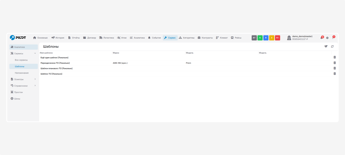 Во вкладке «Шаблоны» хранятся все сохранённые шаблоны сервисного обслуживания. Шаблоны помогают быстро создавать новые записи о сервисе, не заполняя всю информацию заново.