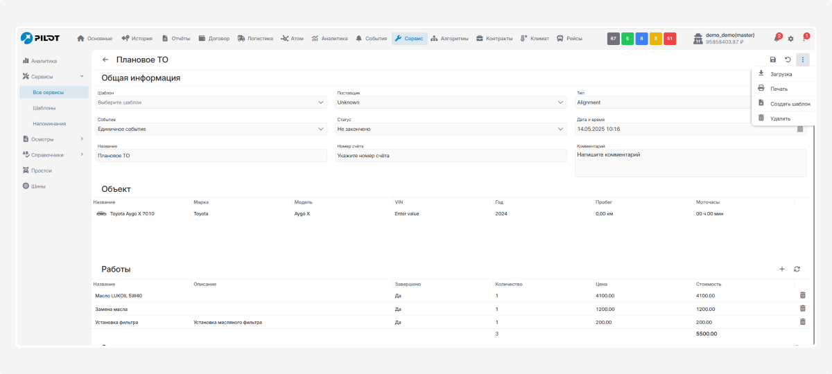 Дата и время — укажите, когда было или будет выполнено обслуживание
