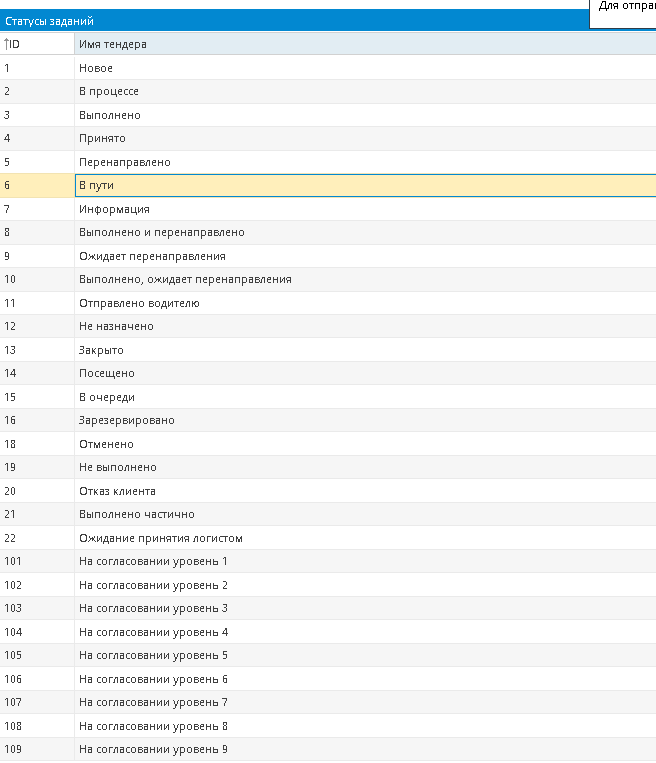 Статусы заданий Вкладка набора готовых статусов для заданий в системе. Редактирование списка статусов администраторами или логистами не доступно.