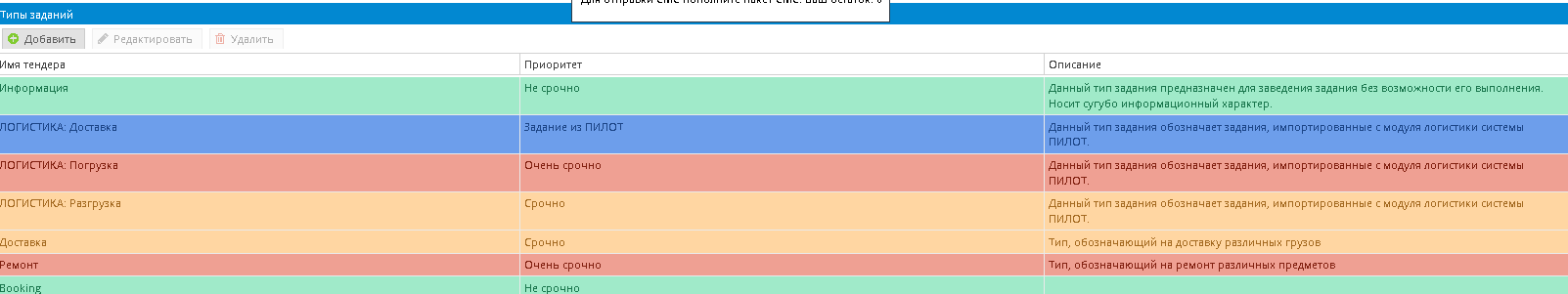Типы заданий с цветовым кодом по важности статусов.