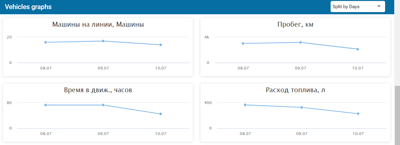 Важно! В зависимости от подключенных модулей, к примеру Эко вождение, модуль ПТМ или нарушения в Геозонах, эти значения также будут выведены в графики по соответствующим темам.