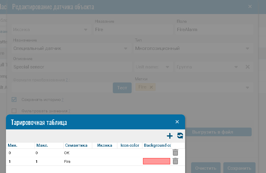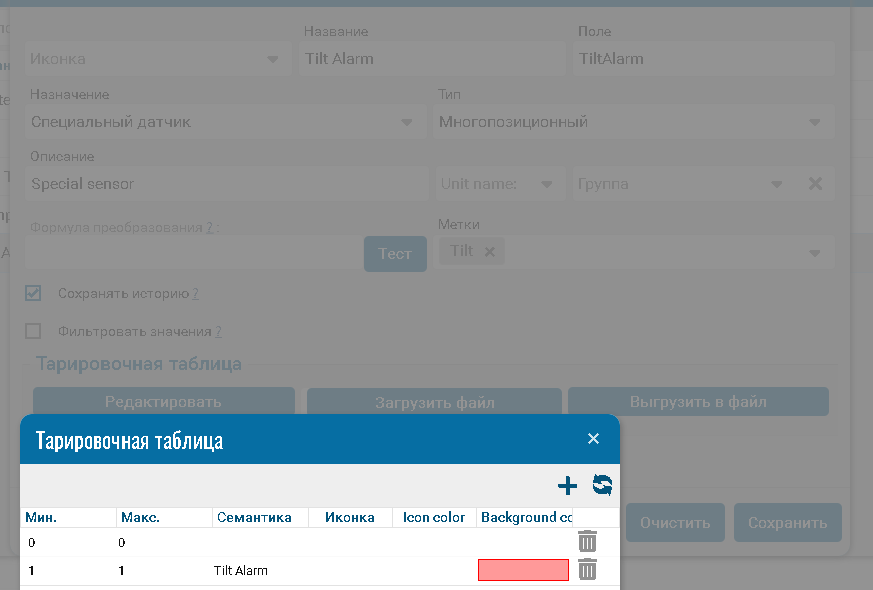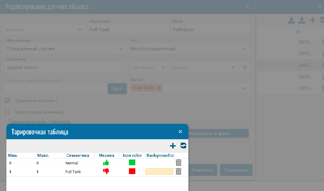 Датчики Перейти в контекстное меню объекта Добавить датчики 1. Уровень заполнения ( пустой/ полный) 2. Температура 3. Возгорание 4. Сигнализация наклона