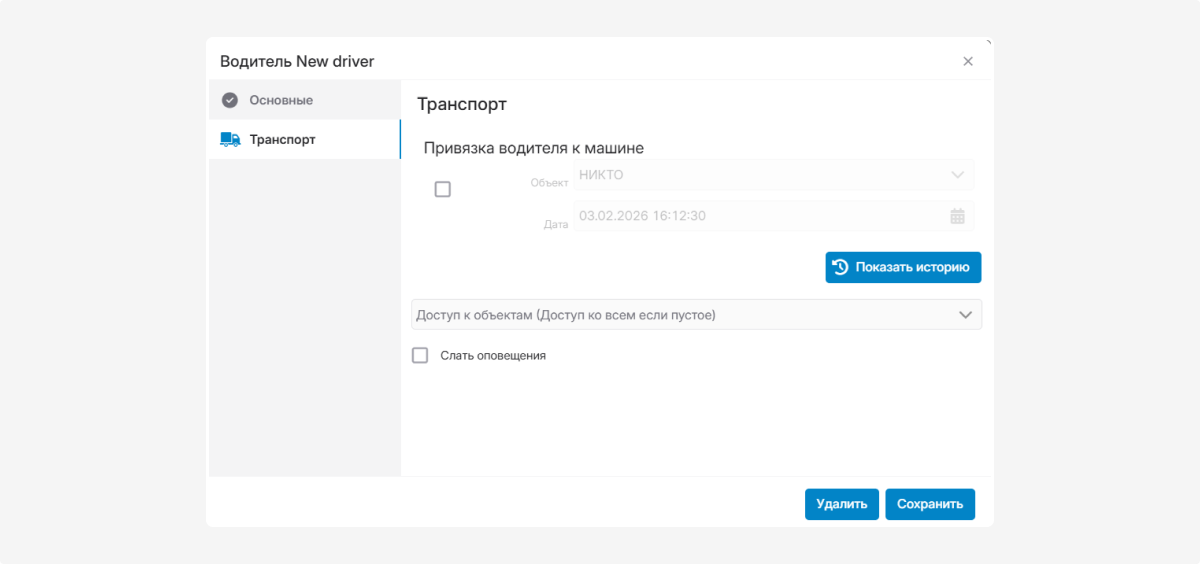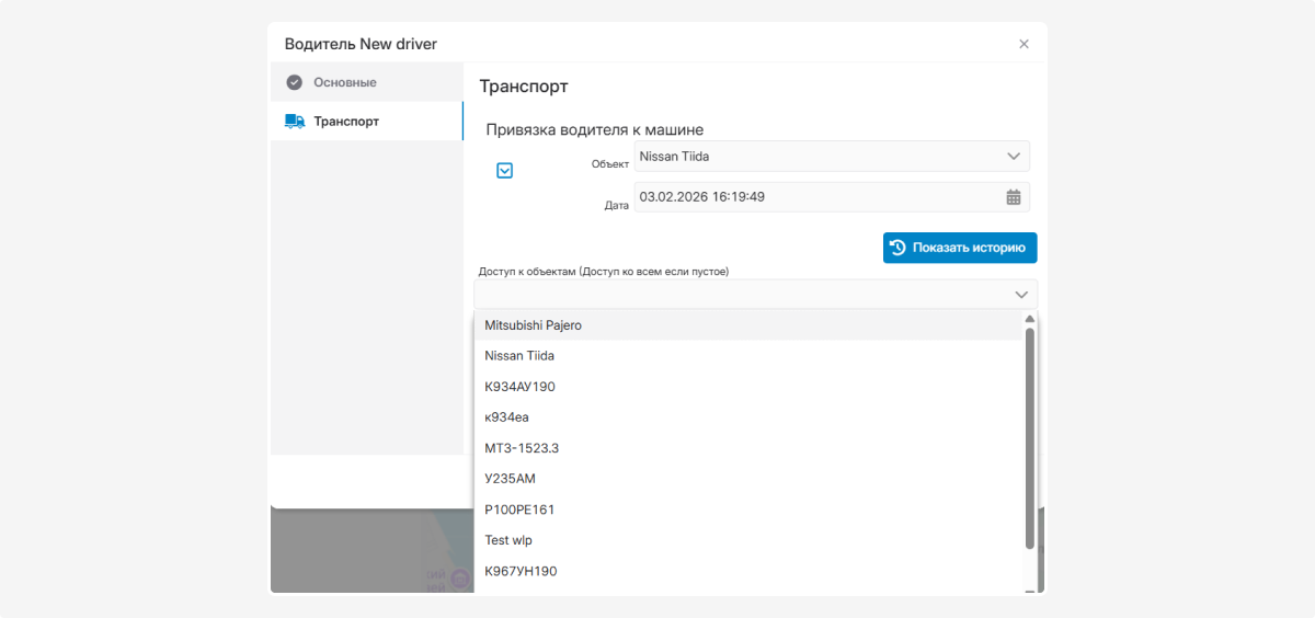 Поле «Доступ к объектам» позволяет выбрать, к каким объектам водитель будет иметь доступ в системе.