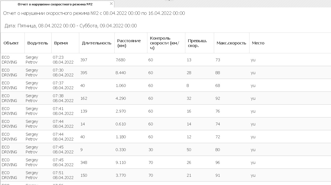 Данный отчёт предназначен для вывода нарушений скоростного режима с водителями, которые были привязаны к объекту.