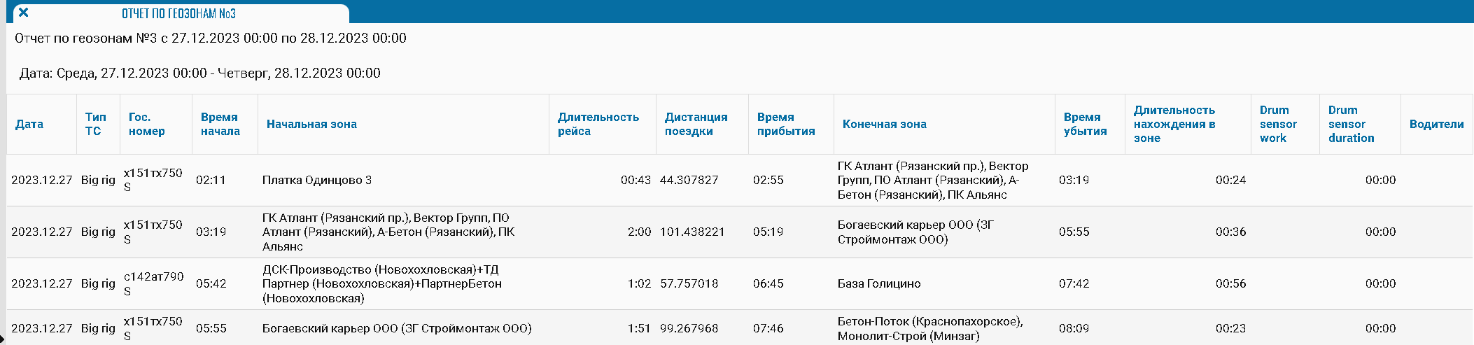 Отчёт по геозонам #3 предназначен для учёта начальной геозоны объекта и конечной с дополнительными параметрами о пробеге и времени.