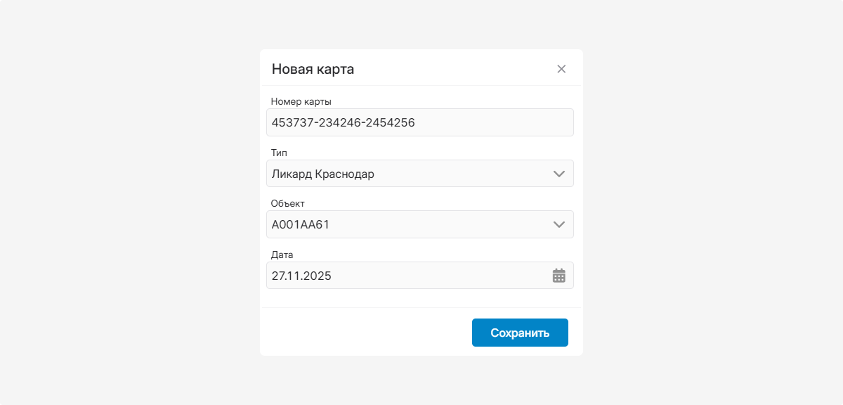 Здесь вы можете добавлять и просматривать топливные карты.