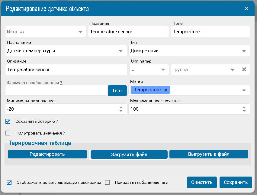 Датчики Перейти в контекстное меню объекта Добавить датчики 1. Уровень заполнения ( пустой/ полный) 2. Температура 3. Возгорание 4. Сигнализация наклона