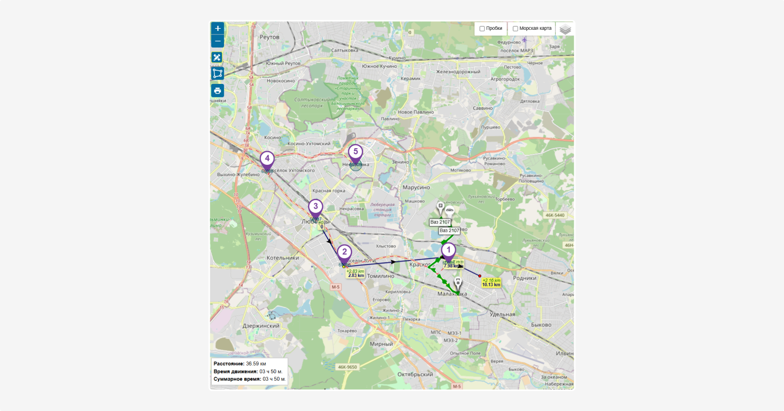 Полоса прокрутки (тайм-линия) отображает весь интервал маршрута. Перетаскивая ползунок, вы можете вручную перейти к любому моменту маршрута и увидеть точное положение автомобиля на карте