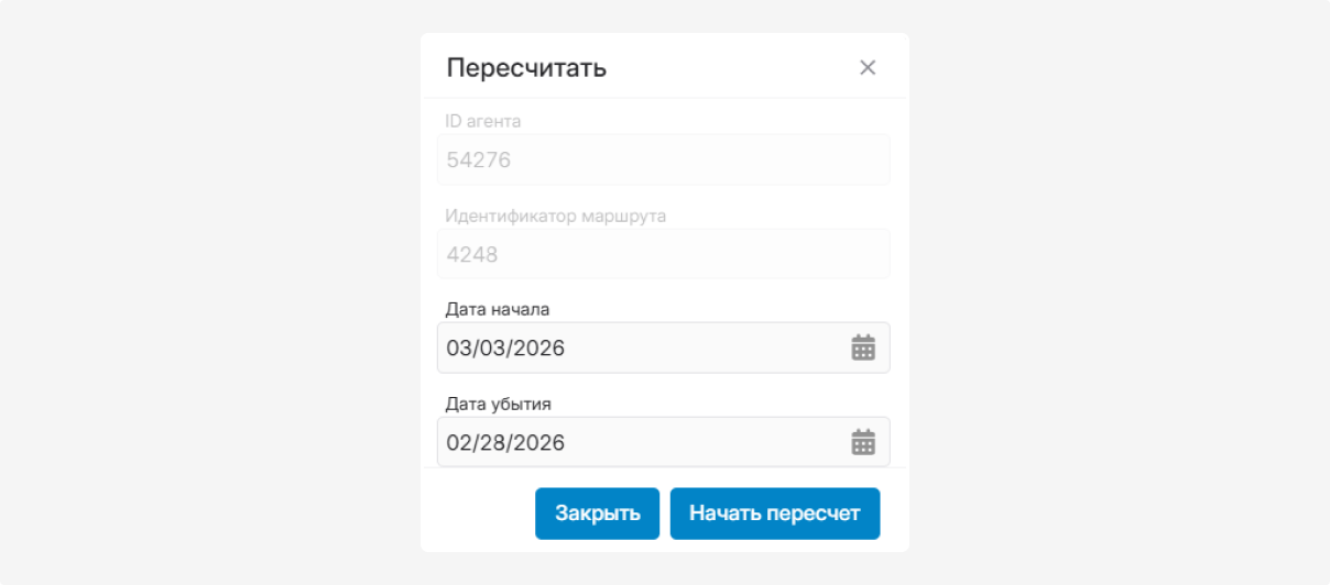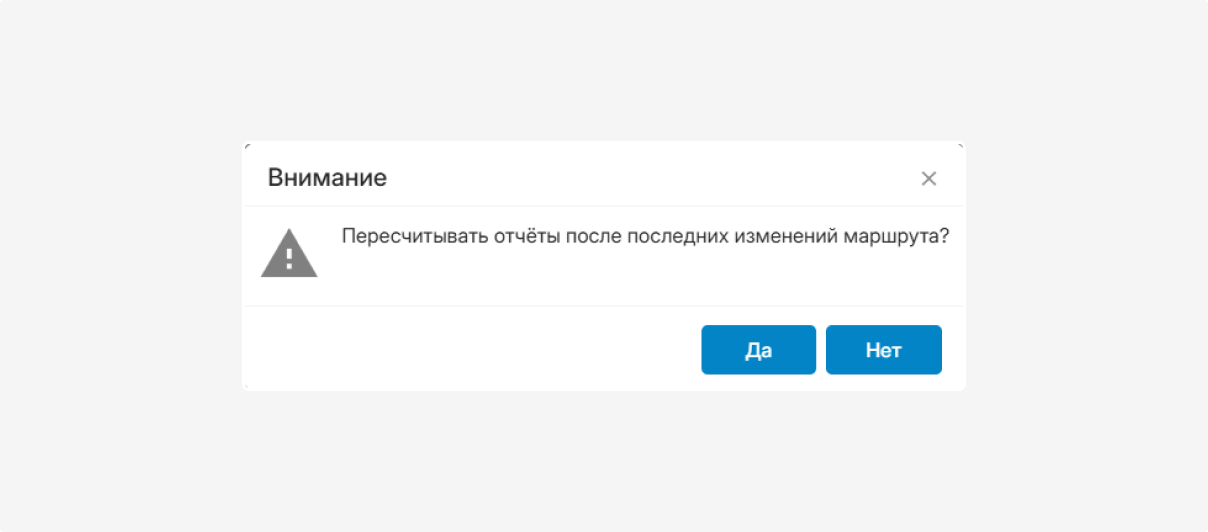 После сохранения система предложит пересчитать отчёты, так как были изменены или перепривязаны маршруты для этого объекта. Пересчёт нужен для того, чтобы все данные были актуальными и отчёты корректно учитывали изменения маршрутов.