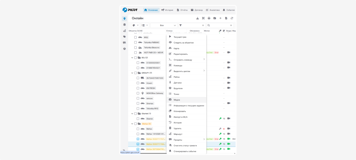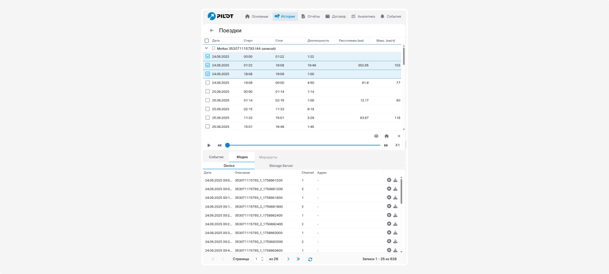 В разделе «История» вы можете не только просматривать треки объекта, но и работать с видео: смотреть записи, скачивать фрагменты или проверять зафиксированные нарушения.