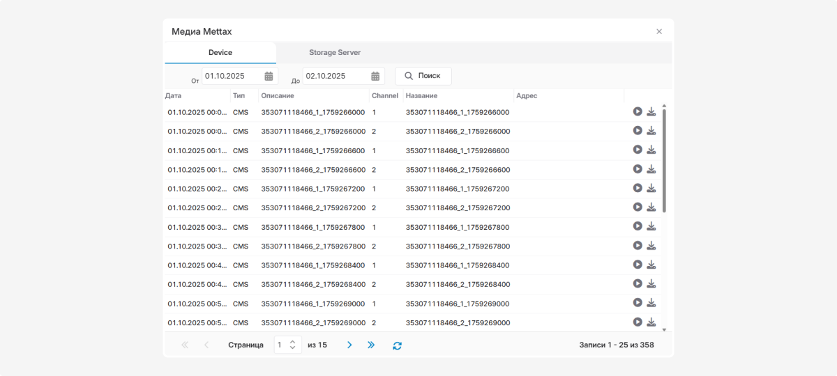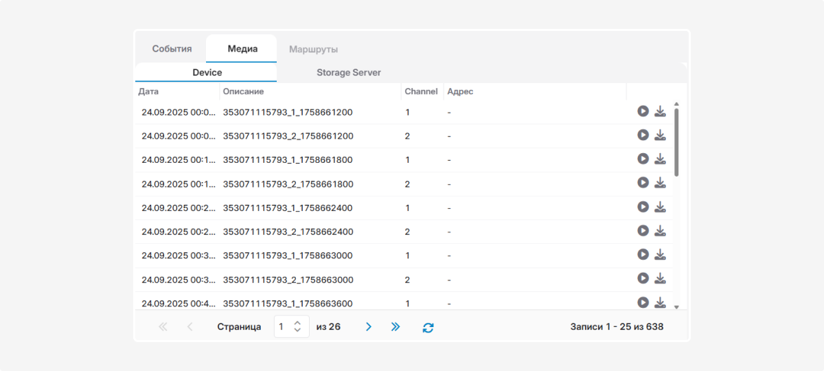 Device — записи, которые хранятся на самом устройстве (видеорегистраторе или камере)