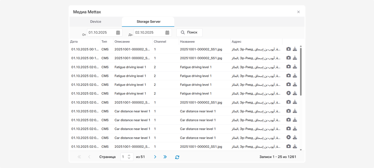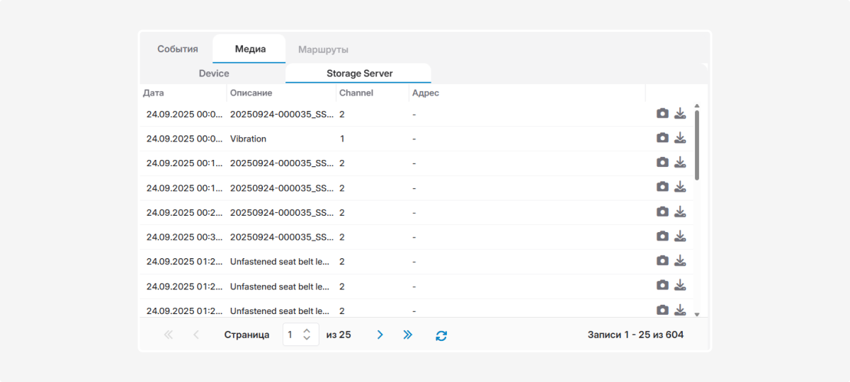 Storage Server — записи, которые хранятся на сервере (например, события DMS/ADAS: не пристёгнут ремень, усталость, курение и т. д.)