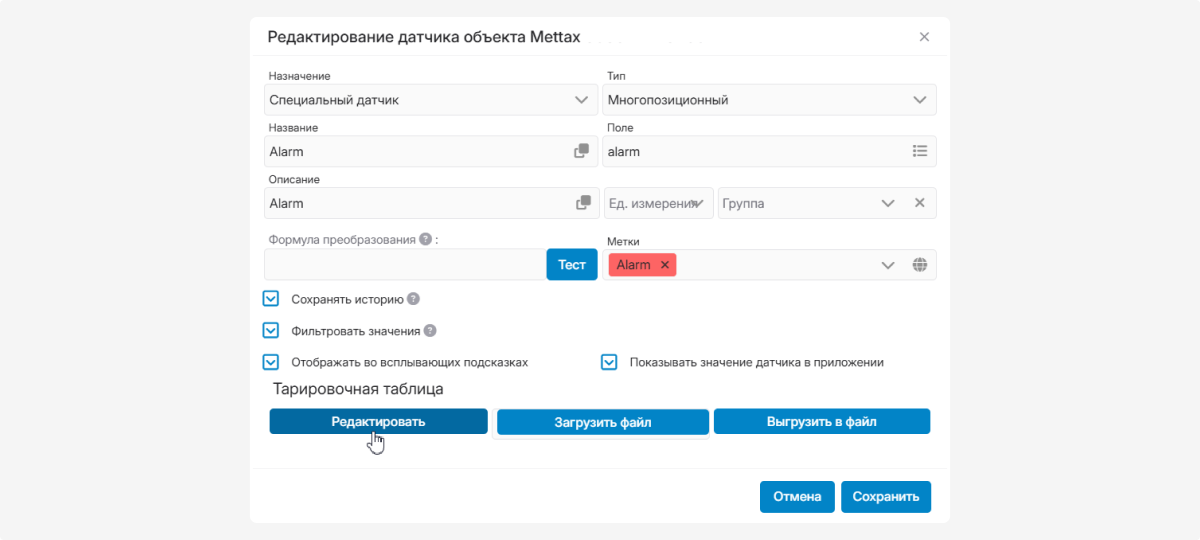 Устройство отправляет коды нарушений, а в PILOT эти коды автоматически сопоставляются с тарировочной таблицей значений датчика.