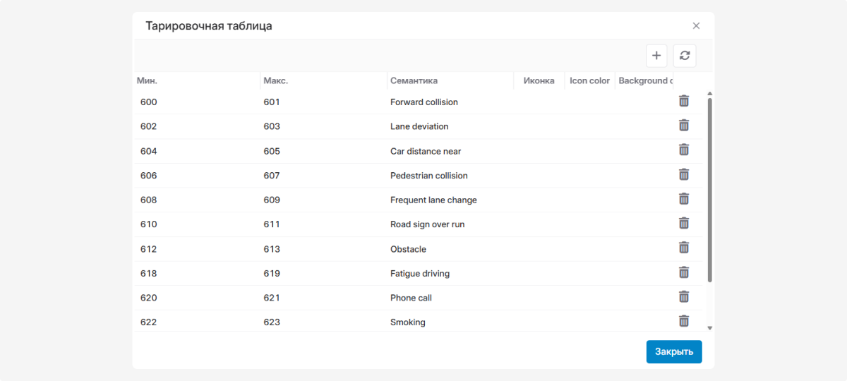 Когда водитель допускает одно из таких нарушений, устройство передаёт в систему код вместе с фото или видео. Базовый набор кодов нарушений уже встроен в тарировочную таблицу, поэтому основные события фиксируются сразу, без дополнительной настройки.