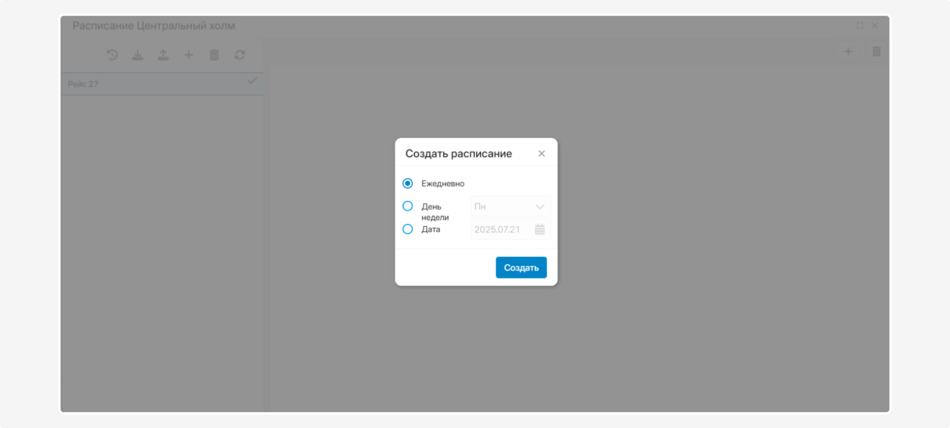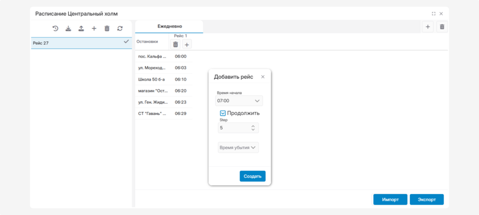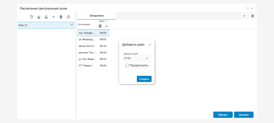 Если поставить галочку «Продолжить», система создаст несколько рейсов подряд с заданным интервалом (шагом) и временем отправления. Если галочку не ставить, вы сможете добавить и настроить каждый рейс вручную, указав для него своё время отправления.