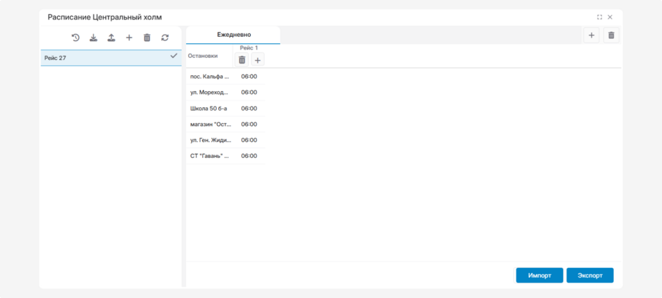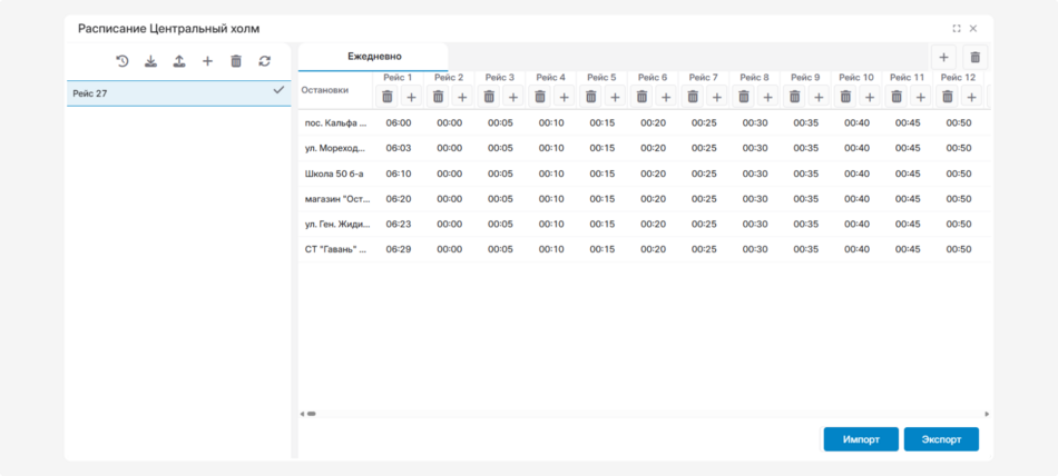 Используйте кнопки «Импорт» и «Экспорт» для загрузки расписаний из файлов или их выгрузки.