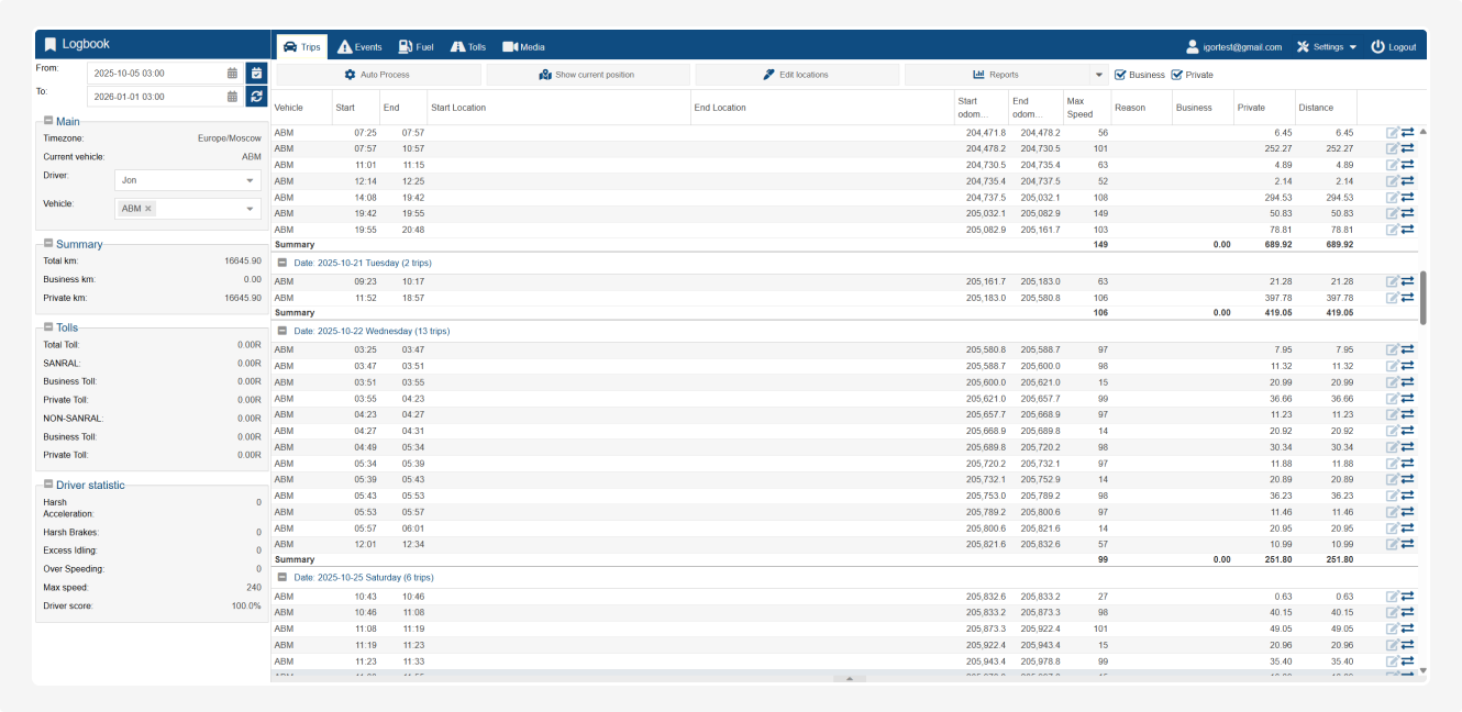1. В левой панели Logbook выберите период From / To и Vehicle (Транспорт)