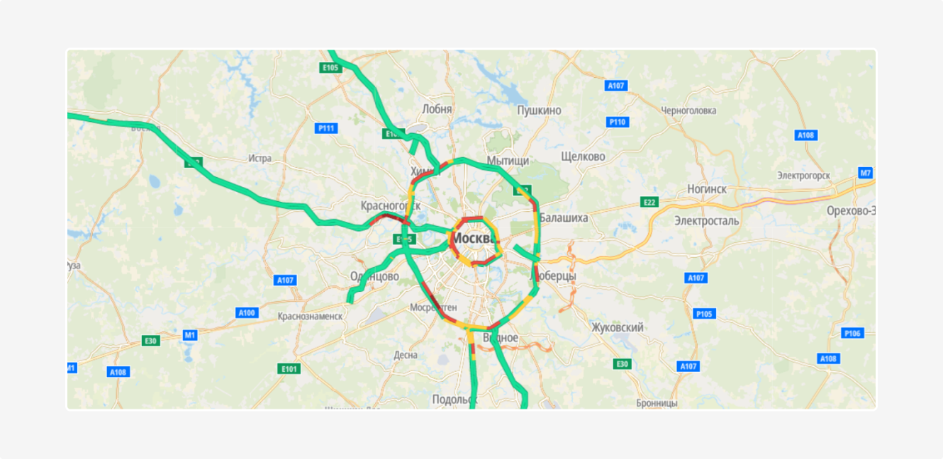 Функция просмотра пробок показывает текущую загруженность дорог с помощью цветовой индикации: