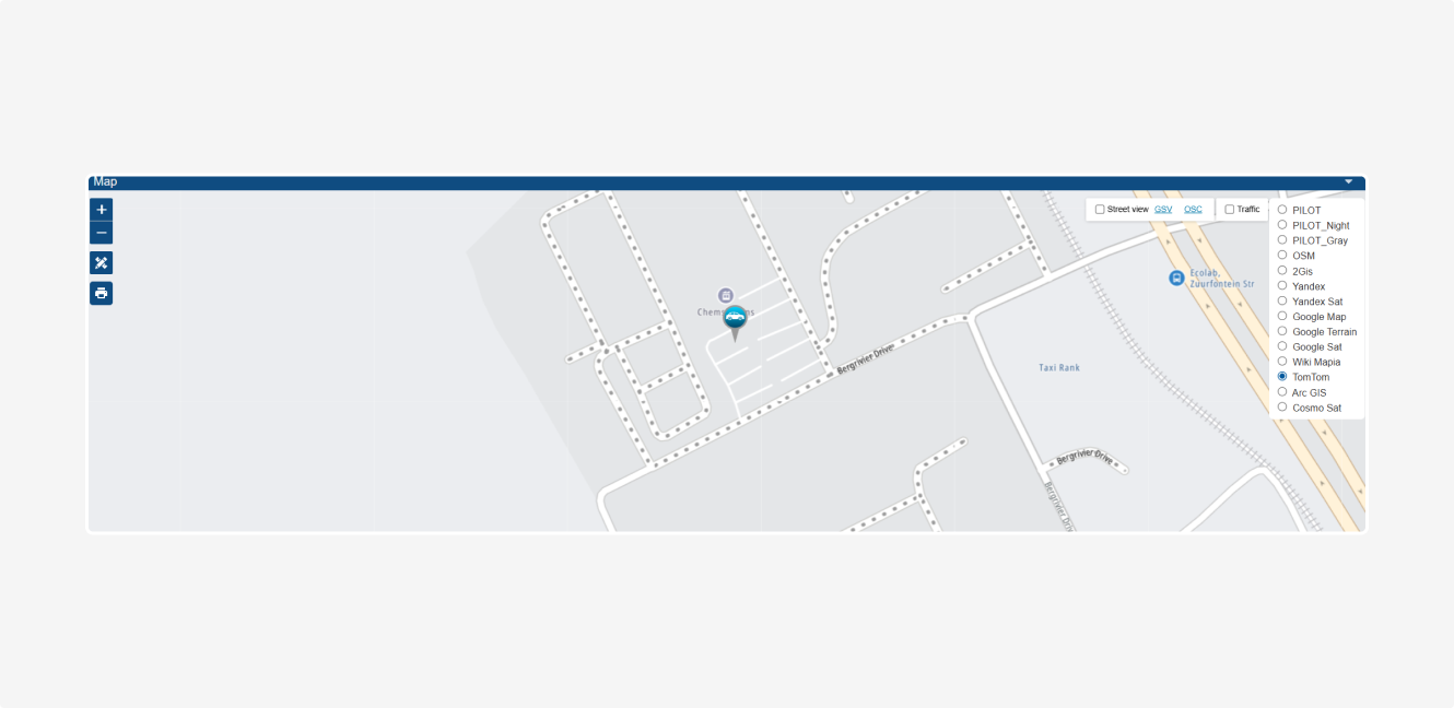 Вы можете выбрать несколько типов карт для отображения пространства в интерфейсе LogBook. Тип карты — это базовый слой картографического изображения, который используется в системе мониторинга для отображения пространственных данных. Для смены карты нажмите кнопку выбора карты .