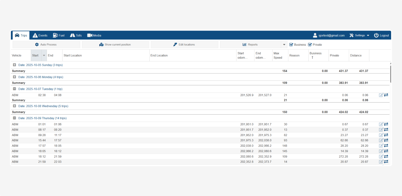 Функция Auto Process (Автообработка) помогает автоматически разделять поездки на рабочие и частные.