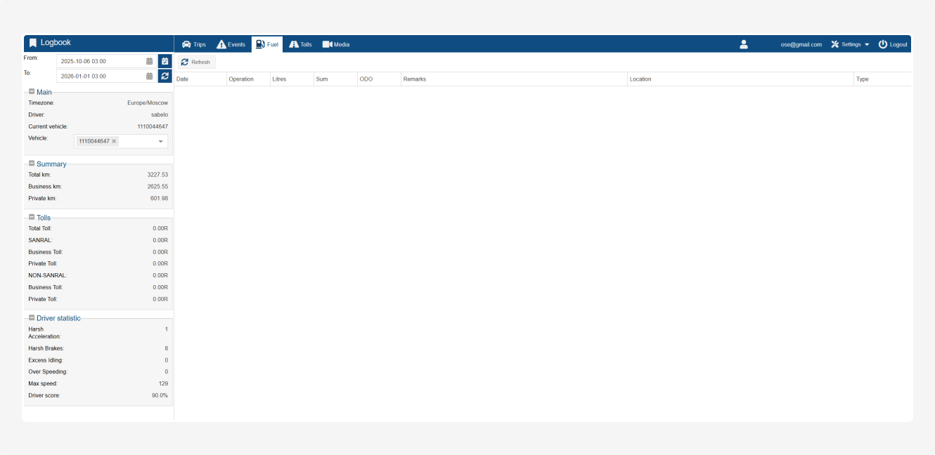 В разделе Fuel (Топливо) отображаются все транзакции, связанные с топливом по выбранному автомобилю и периоду.