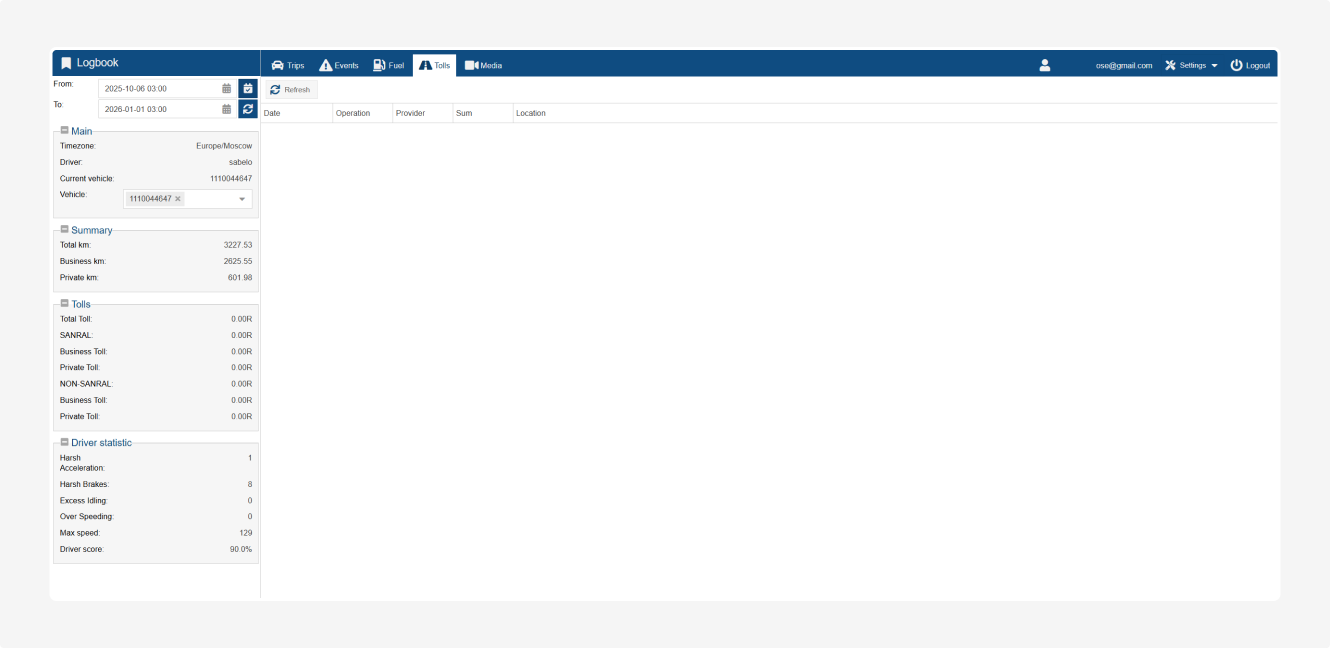 В разделе Tolls (Платные дороги) отображаются все транзакции по платным участкам дорог за выбранный период и по выбранному автомобилю.