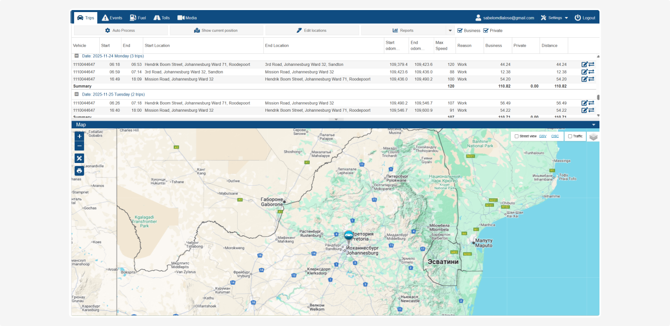 • Reports (Отчёты) – создаёт отчёты по поездкам и расходам за выбранный период