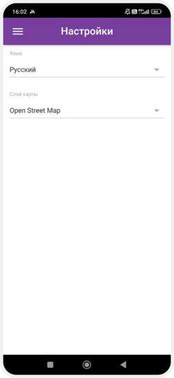 Настройки — здесь можно выбрать картографический слой и изменить язык приложения
