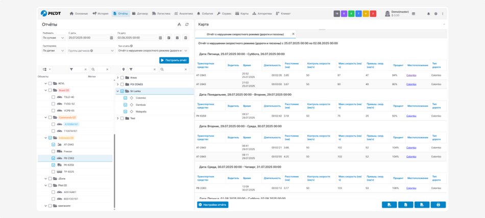 Отчёт о нарушениях скорости в геозонах и на дорогах помогает контролировать, где и когда транспортные средства превышали скорость — как на обычных дорогах, так и внутри геозон (например, на территории склада, стройки или в определённом районе).