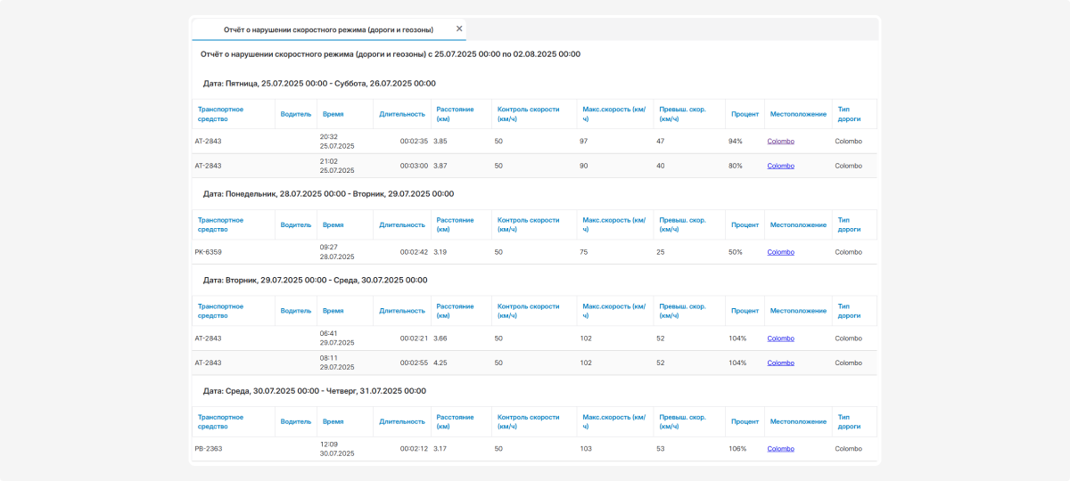 Этот отчёт объединяет данные из двух модулей — «Контроль нарушений» и «Геозоны». В результате вы видите все случаи превышения скорости как на обычных дорогах, так и внутри заданных геозон, в одном общем отчёте.
