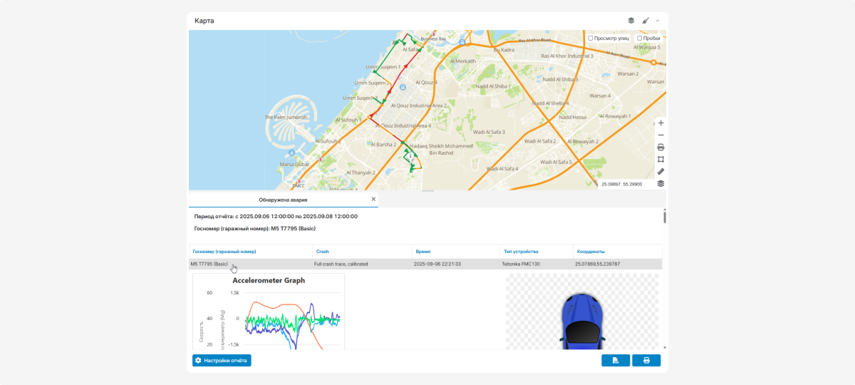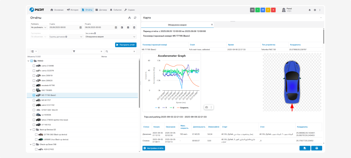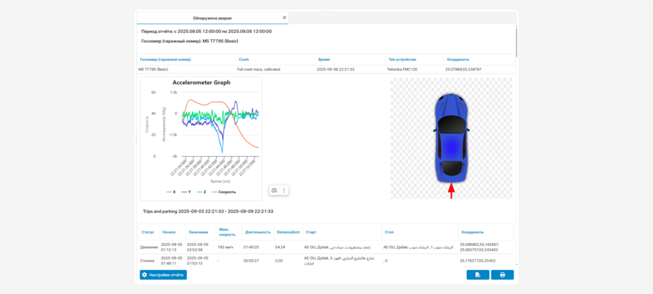 Отчёт доступен, если включён модуль «Обнаружение аварий». Он помогает подробно разобрать, что произошло с транспортным средством: когда и где случилось происшествие, с какой скоростью двигалась машина, в каком направлении был удар, а также какие поездки были в этот период.