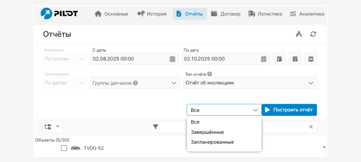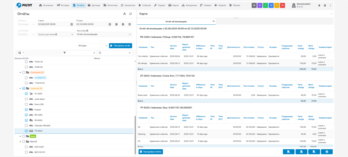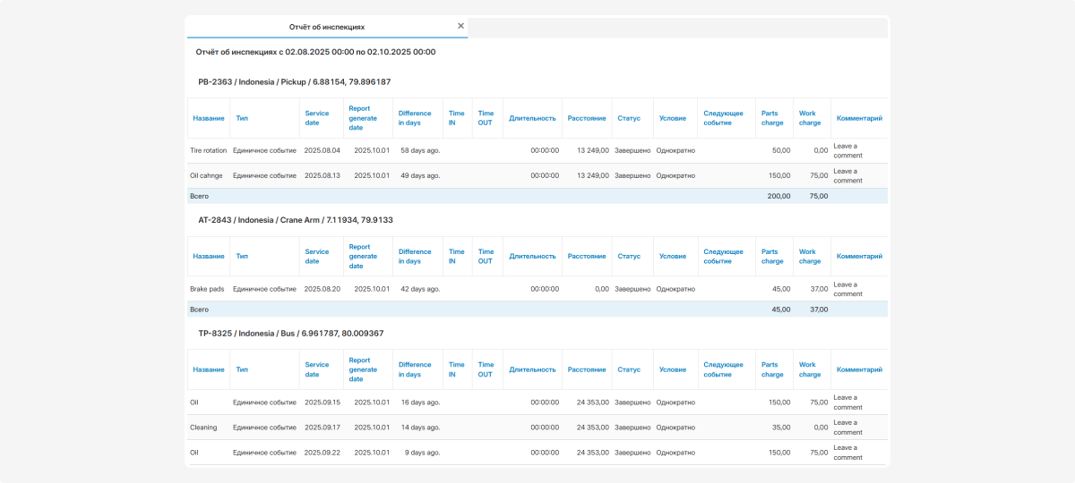 Отчёт об инспекциях помогает контролировать все выполненные сервисные операции по каждому транспортному средству за выбранный период.